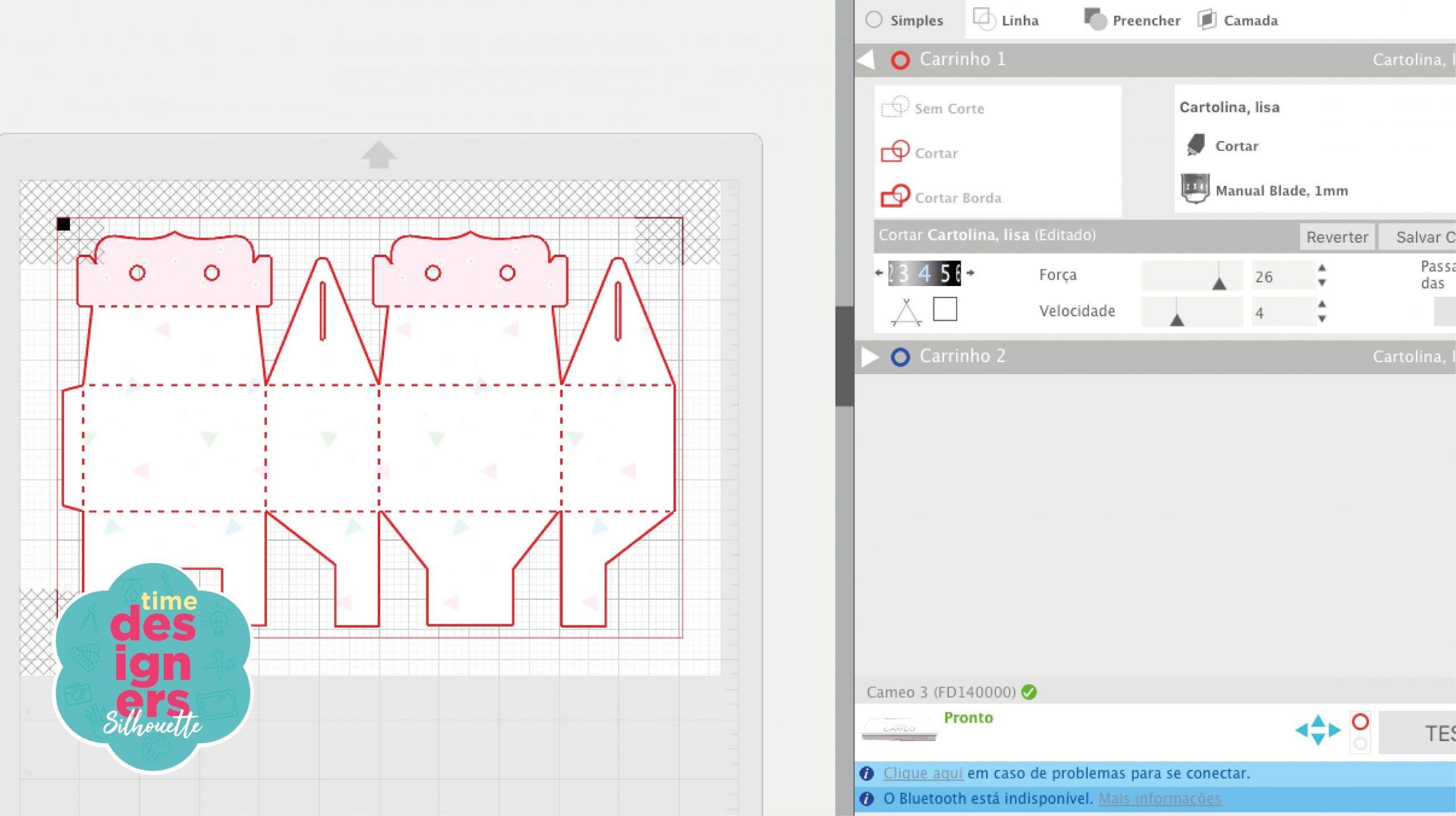 Com a folha impressa é hora de enviar para o corte. Certifique-se se o material, a força e velocidade, estão corretos para o tipo de papel que vai usar.